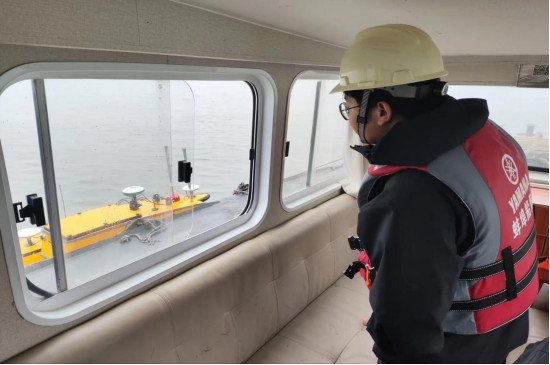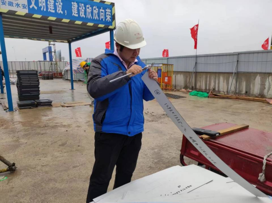 淮河航道临淮岗复线船闸工程总监办监理人员正在检查玻璃幕墙背衬板厚度